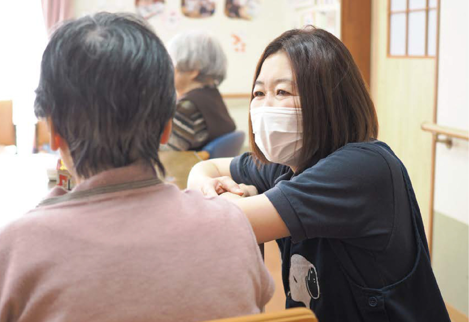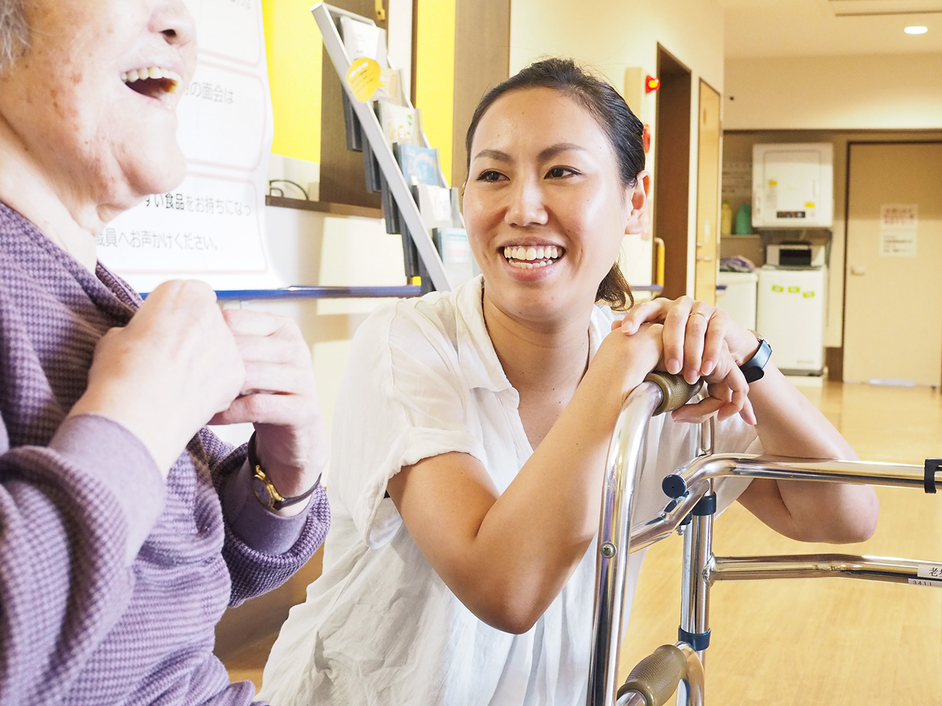 もともと介護職につきたいと思いつつも高校卒業後は接客業に就いた後に、将来のことを考え長く働けるなどの理由から入職。人と接するのが好きで、どんなことにもまっすぐ向き合う真面目さゆえによく悩んでしまうものの、周囲に相談しながらひとつひとつ乗り越えて成長している。今後は介護福祉士の資格を取得して一つステップアップを目指す。
