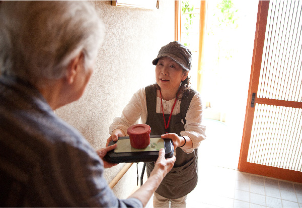 地域の方々にお弁当の配達をしております。独居の高齢者の方々も増えている現在、ますます需要が上がってきています。手渡しによる安否確認も求められているサービスのひとつです。