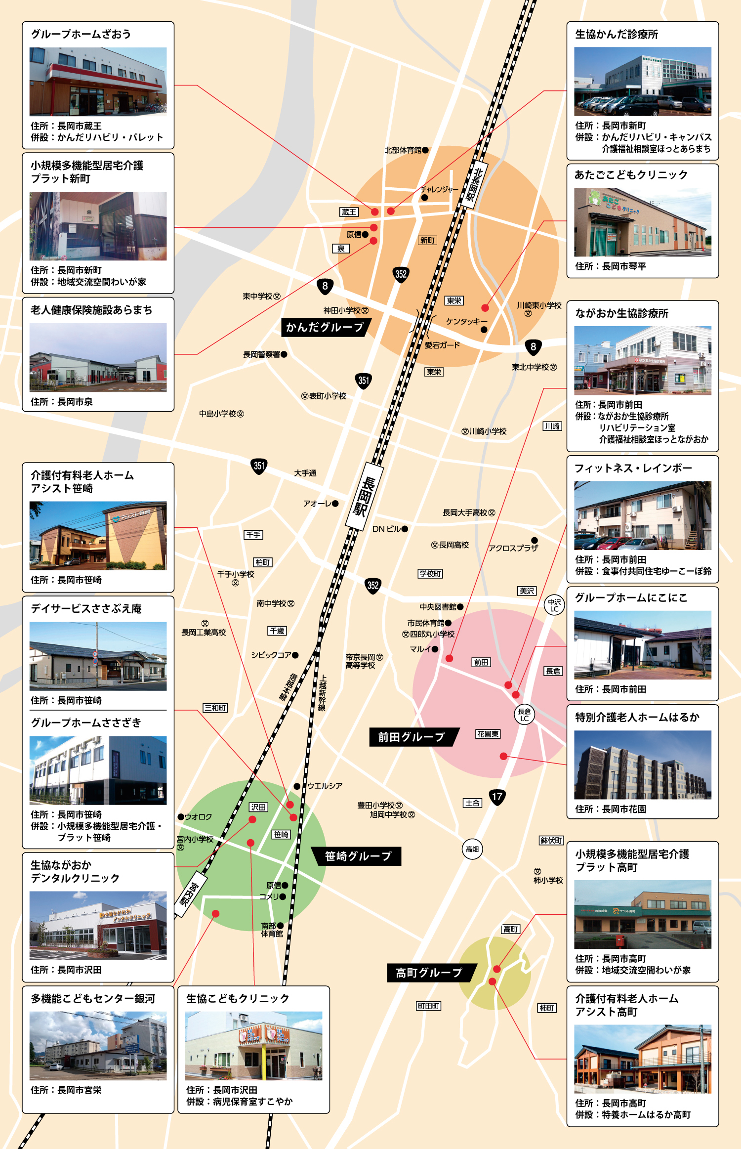 ながおか医療生協が運営する事業所は「ながおか生協診療所」「生協かんだ診療所」「生協こどもクリニック」他に、デイサービス等の介護事業所を運営しています。