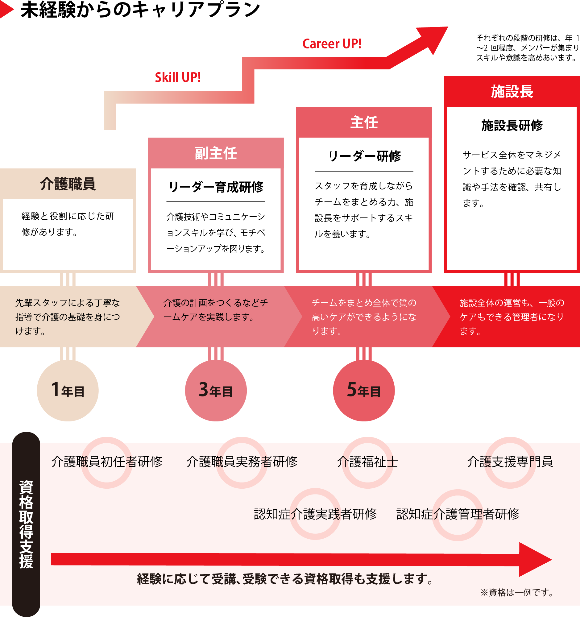 スキルを磨いて、現場のプロフェッショナルとしてご利用者様に寄り添うか、キャリアを積んで施設長となって地域福祉の貢献に寄与するか、様々なライフプランを実現できます。法人グループは職員の考え方を尊重した、様々な支援を行っています。